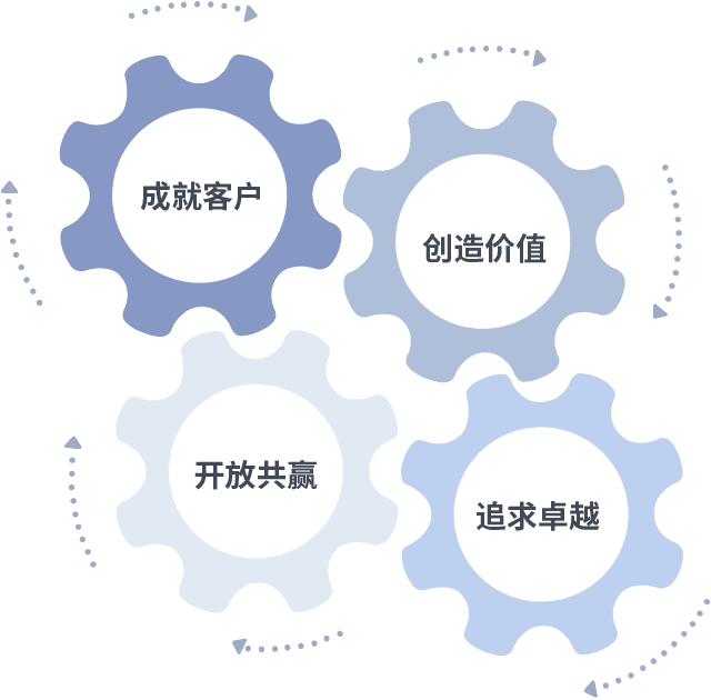 成就客户是一切决策的出发点,,,,创造价值是衡量所有工作的标准,,,追求卓越是我们做事做人的态度,,开放共赢是我们的格局也是最终的结果。。。。价值观的齿轮环环相扣,,,推动着组织里的每个人不断向前。。