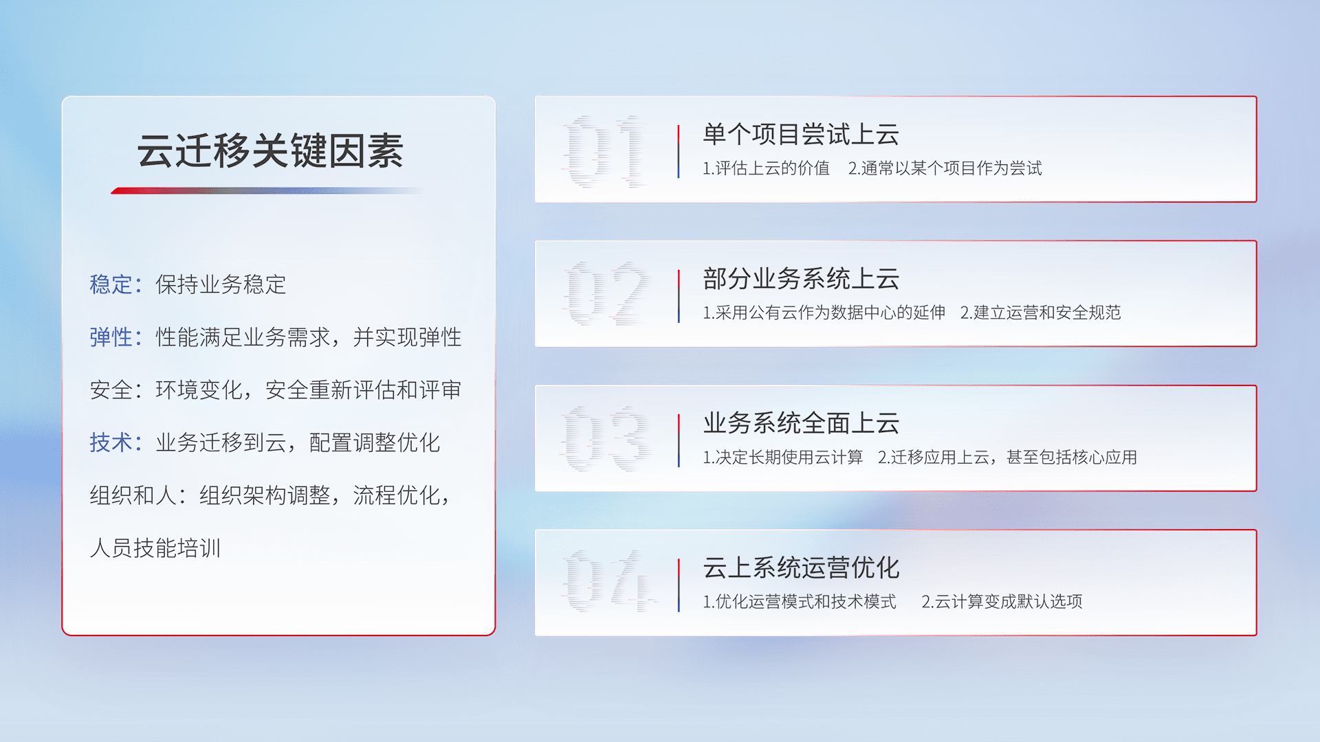 结合实际业务,,,从规划设计、、、云平台选型、、、云原生改造、、数据迁移、、、、集成交付,,迁移全过程为客户识别最佳上云路径,,做好风险识别管理,,,设计网络架构、、、身份权限、、安全审计合规、、、、操作审计、、日志审计、、、、监控告警策略、、、、多站点容灾设计等,,,对云上基础设施进行整体规划,,,,提升IT治理水平,,,,以满足弹性、、、高可用、、、、高性能的需求。。。。