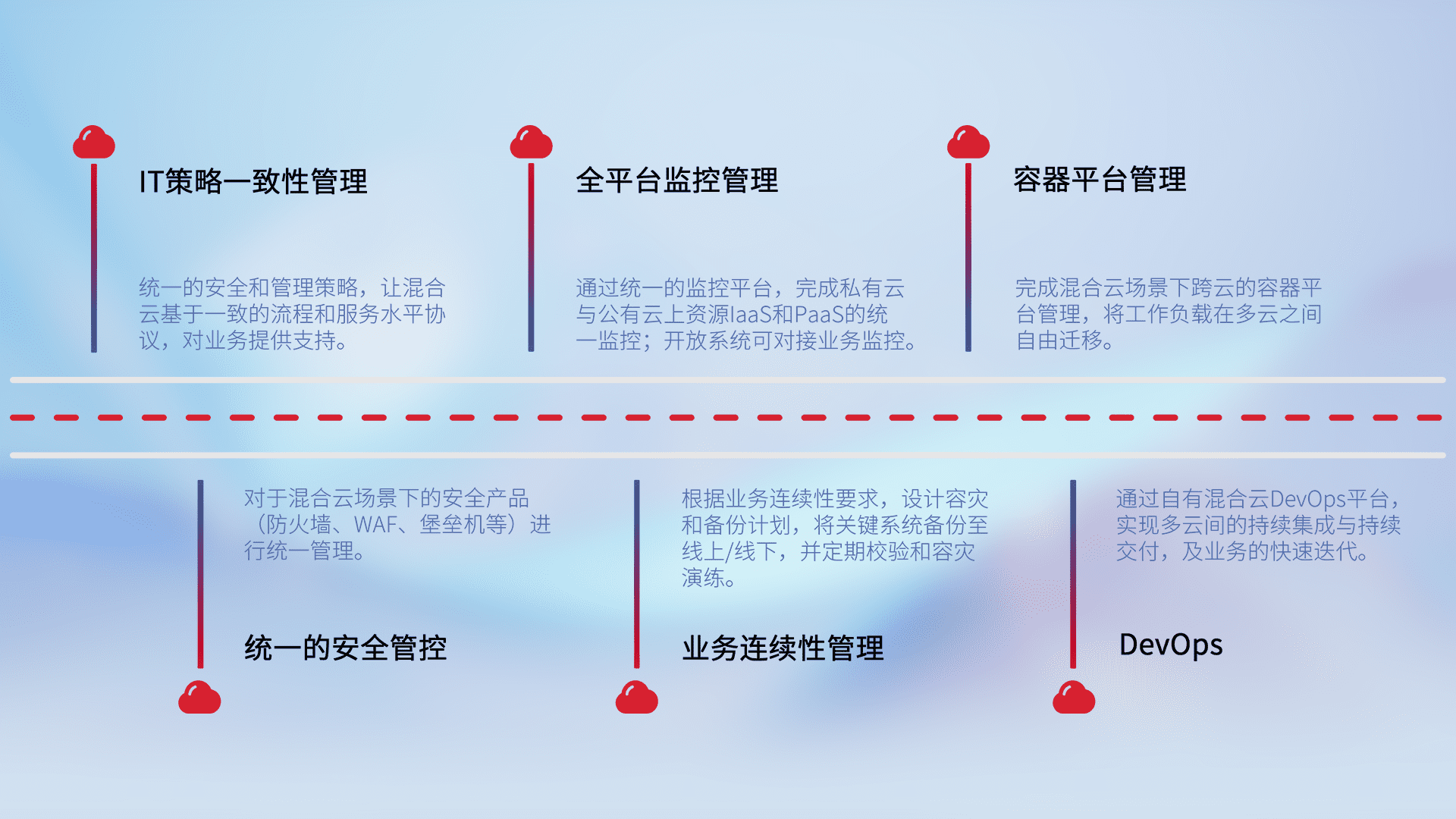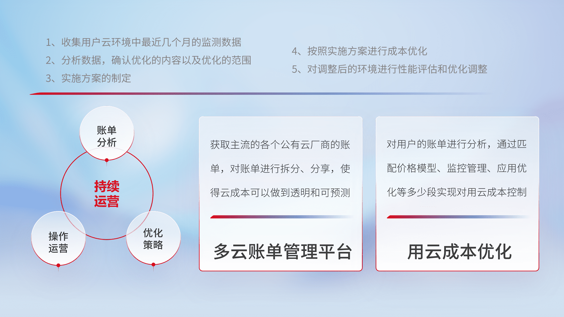 通过多云纳管,,,,以统一的资源数据模型把客户的云资源进行抽象和封装,,,进而实现对多云资源的统一操作,,保障云资源管理的可靠性、、稳定性与可用性。。量身定制化运维内容,,配置、、开发运维、、、补丁管理、、、备份、、、、监控、、、认证和访问管理、、、审计和日常巡检等,,,保障在用云过程中的可靠度,,,稳定度以及高可用率。。。。
