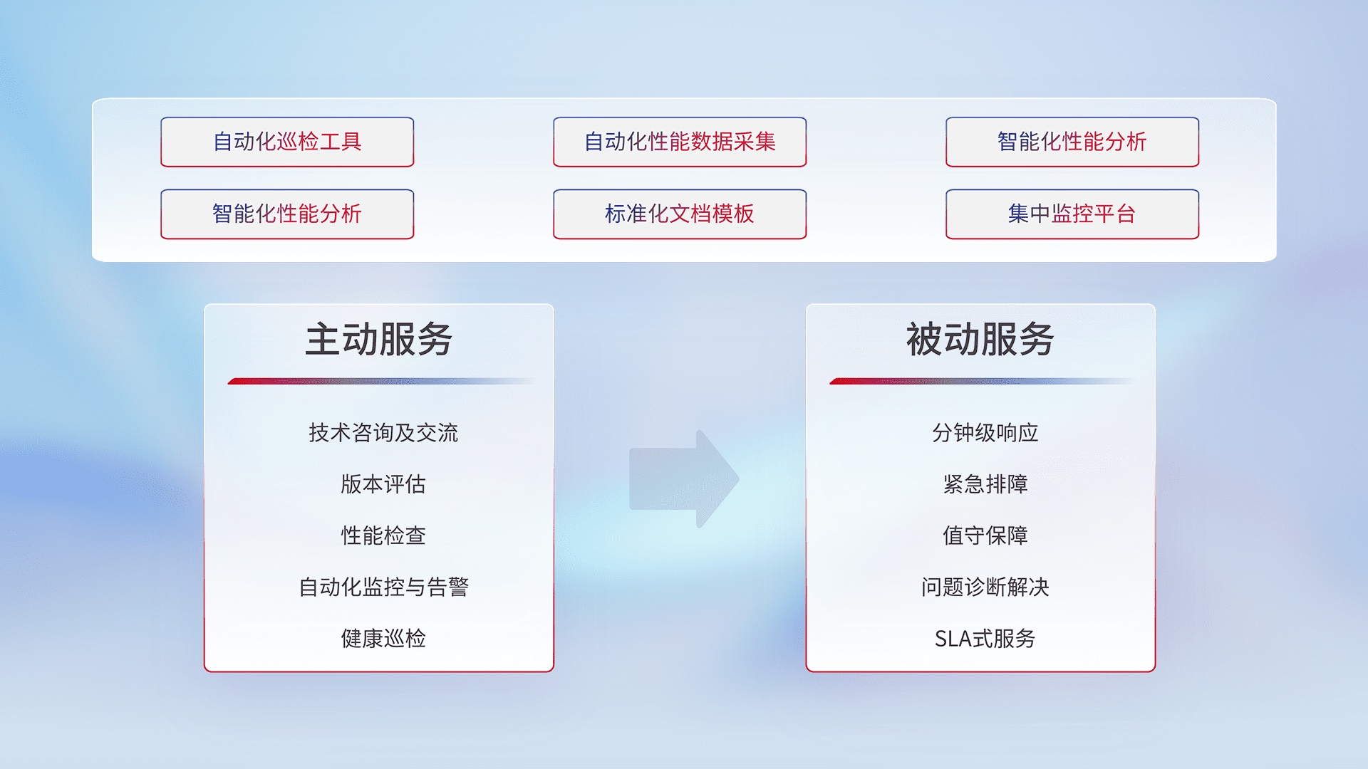 智能化工具和标准化文档,,保障服务质量,,,提供主动服务(包含技术咨询、、版本评估、、性能检查、、、自动化监控与告警、、、、健康巡检)和被动服务包含(分钟级响应、、、紧急排障、、、、值守保障、、、、问题诊断解决、、、、SLA服务)。。